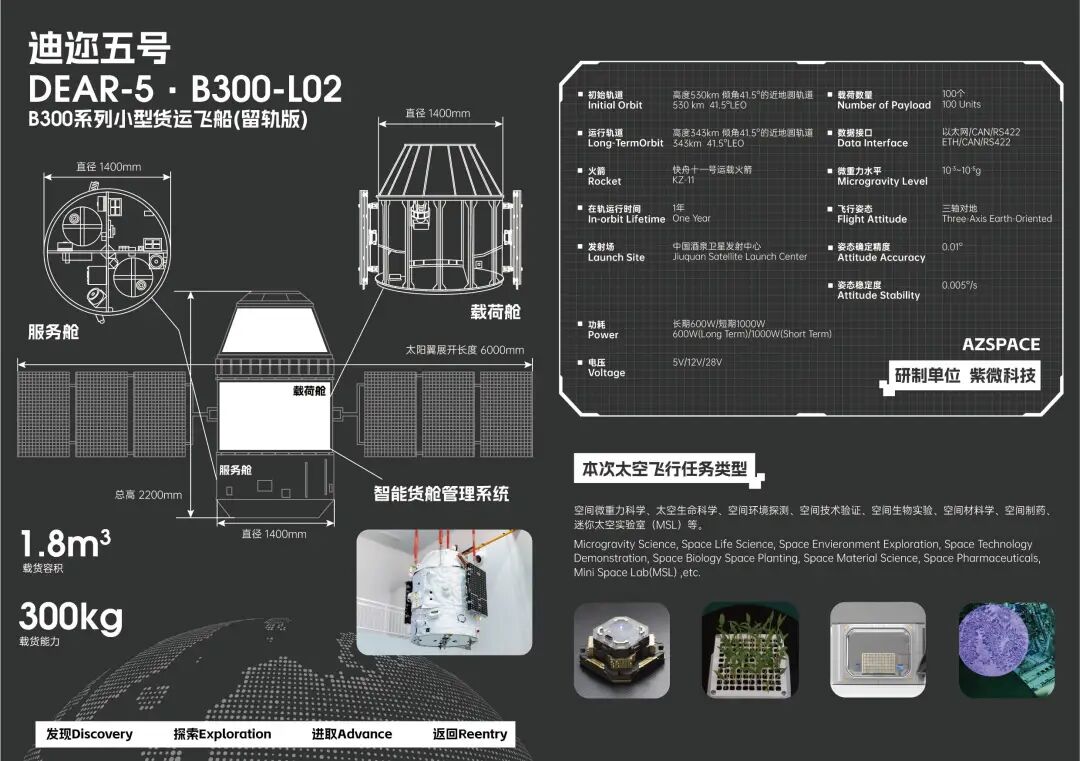 本次成功发射的“迪迩五号”是紫微科技自主研发的小型货运飞船留轨版(B300-L),已满载300kg,载货空间1.8m,具备超过100个载荷的在轨管理能力,设计在轨运行时间1年。